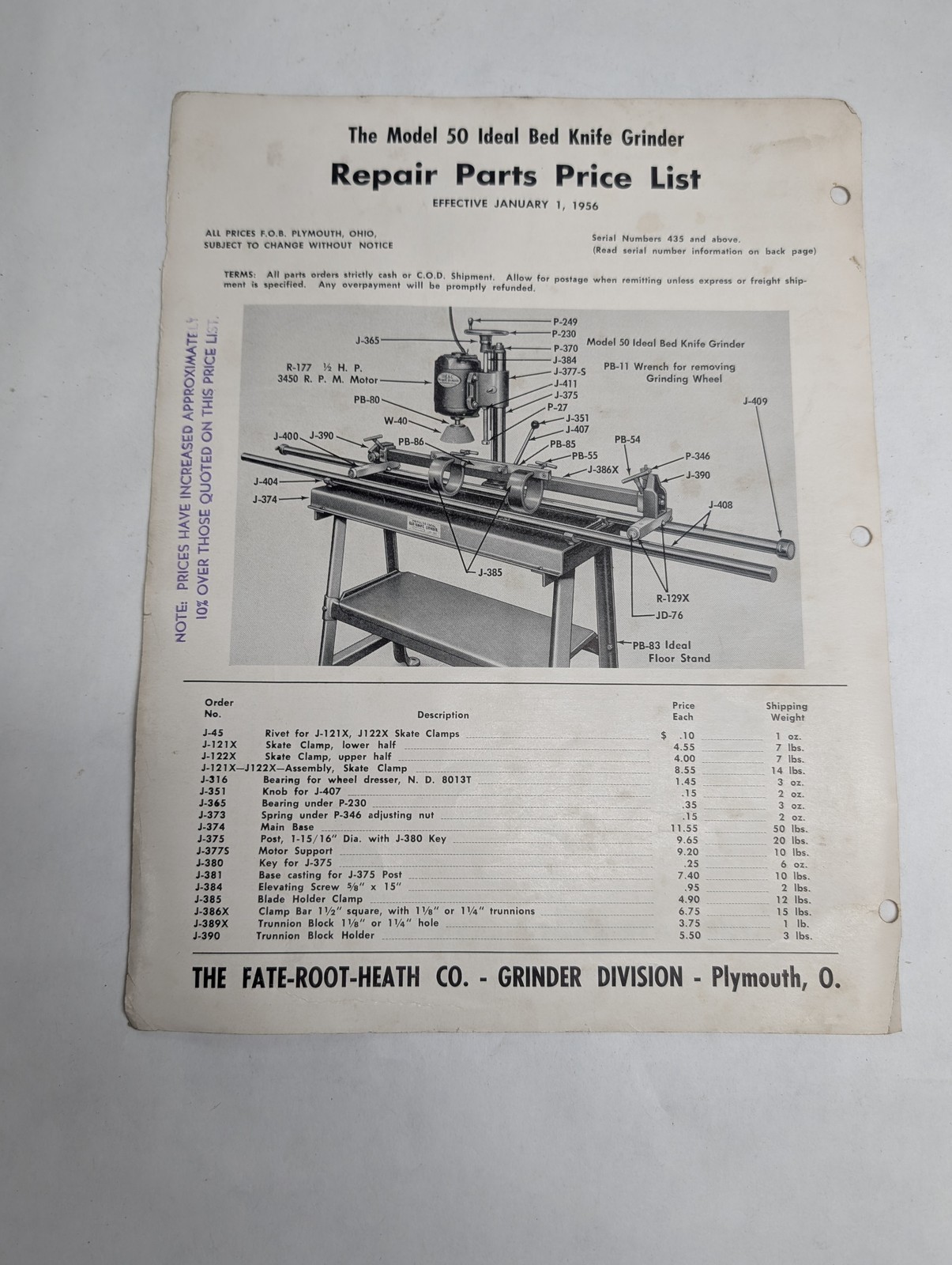 Fate-Root-Heath Model 50 Ideal Bed Knife Grinder Repair Parts Price List 1956~