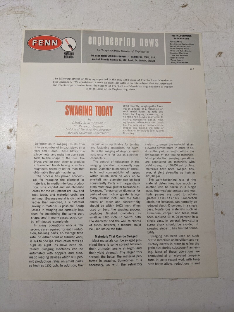 Fenn Swaging Application Sales Brochure Features M-6 Engineering News Machine
