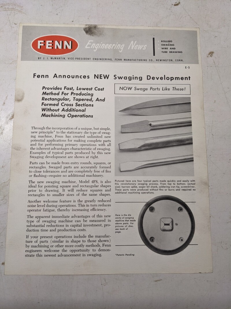 Fenn Swaging Development Sales Brochure Features E-3 Engineering News Machine