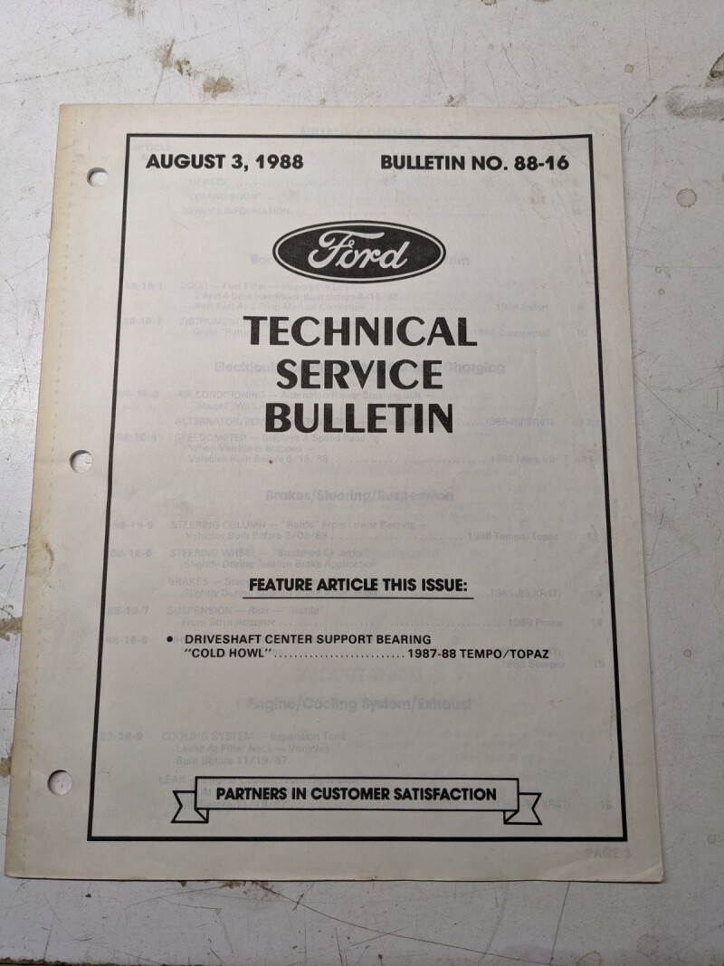 Ford Technical Service Bulletin 88-16 1988 Driveshaft Bearing 1987-88 Temp Topaz