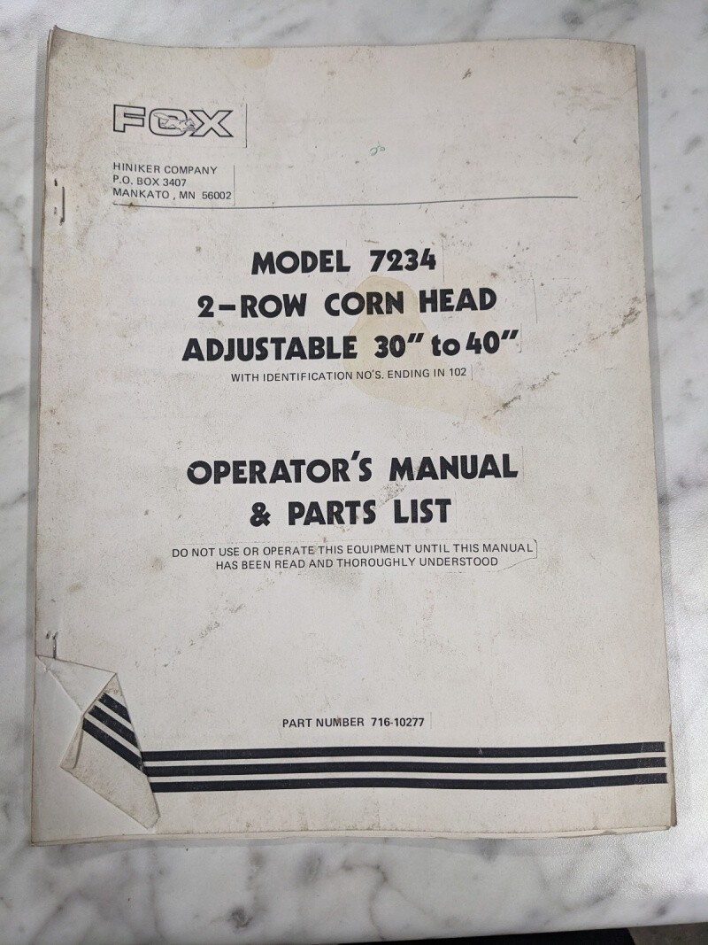 Fox Operator Service Manual Parts List Catalog Model 7234 2 Row Corn Head 10277