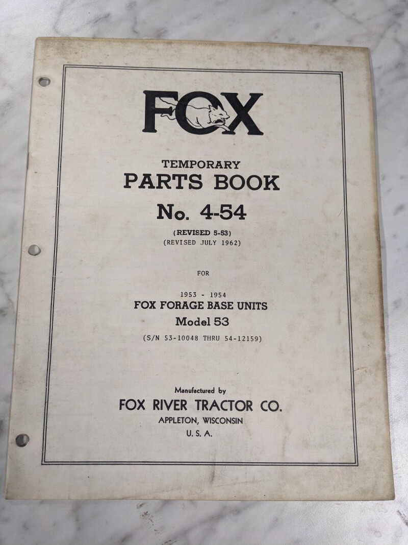 Fox Temporary Service Parts List Book Manual Catalog #4-54 1962 Forage 53