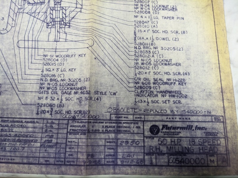 Futurmill 50 Hp Assembly Drawing Print Diagram 1968 18 Speed Rh Milling Head