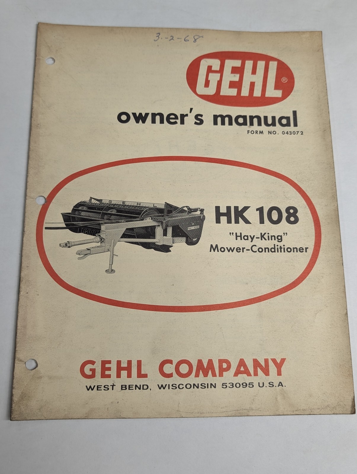 Gehl Owner’S Operators Manual 043072 Hay-King Model Hk 108 Mower Conditioner