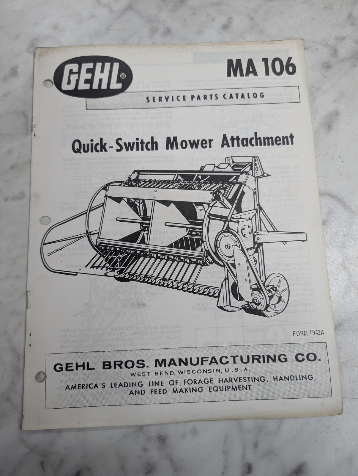 Gehl Service Repair Parts Catalog List Manual Ma 106 Mower Attachment 1942A