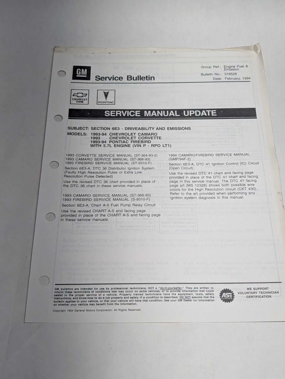Gm Bulletin Manual Update 1993-94 Chevrolet Camaro Corvette Pontiac Firebird