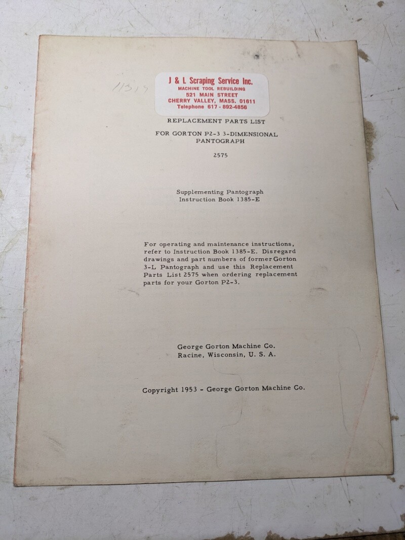 Gorton Replacement Service Parts List Book Manual P2-3 3D Pantograph 2575 1953