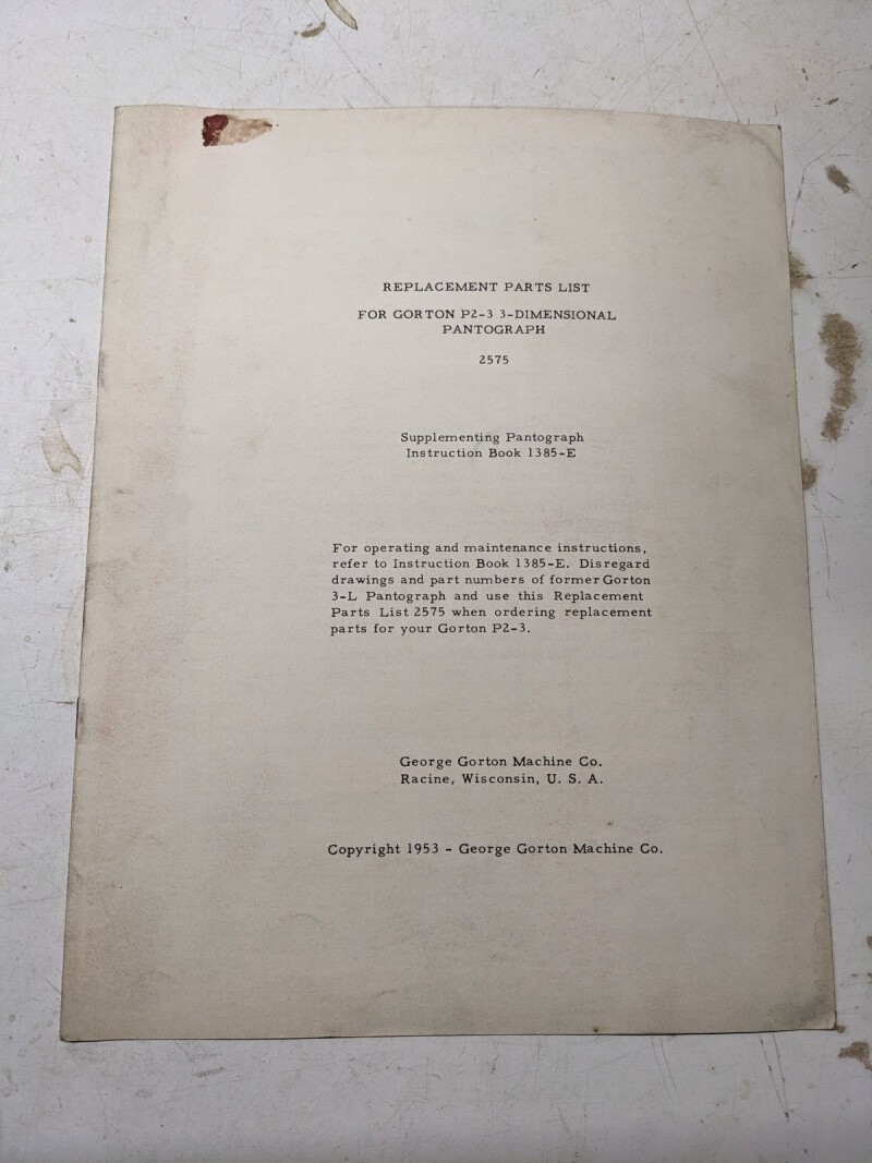 Gorton Replacement Service Parts List Book Manual P2-3 3Dim Pantograph 2575 1953