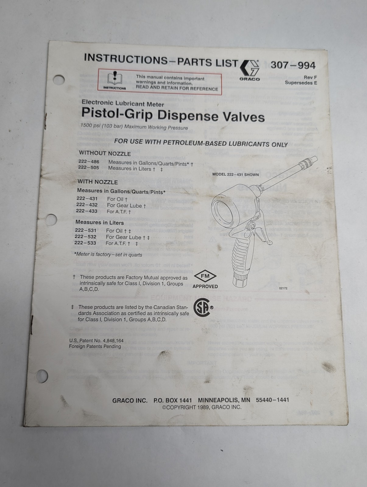 Gracy Pistol Grip Dispense Electronic Lubricant Meter 307-994 Parts List Manual