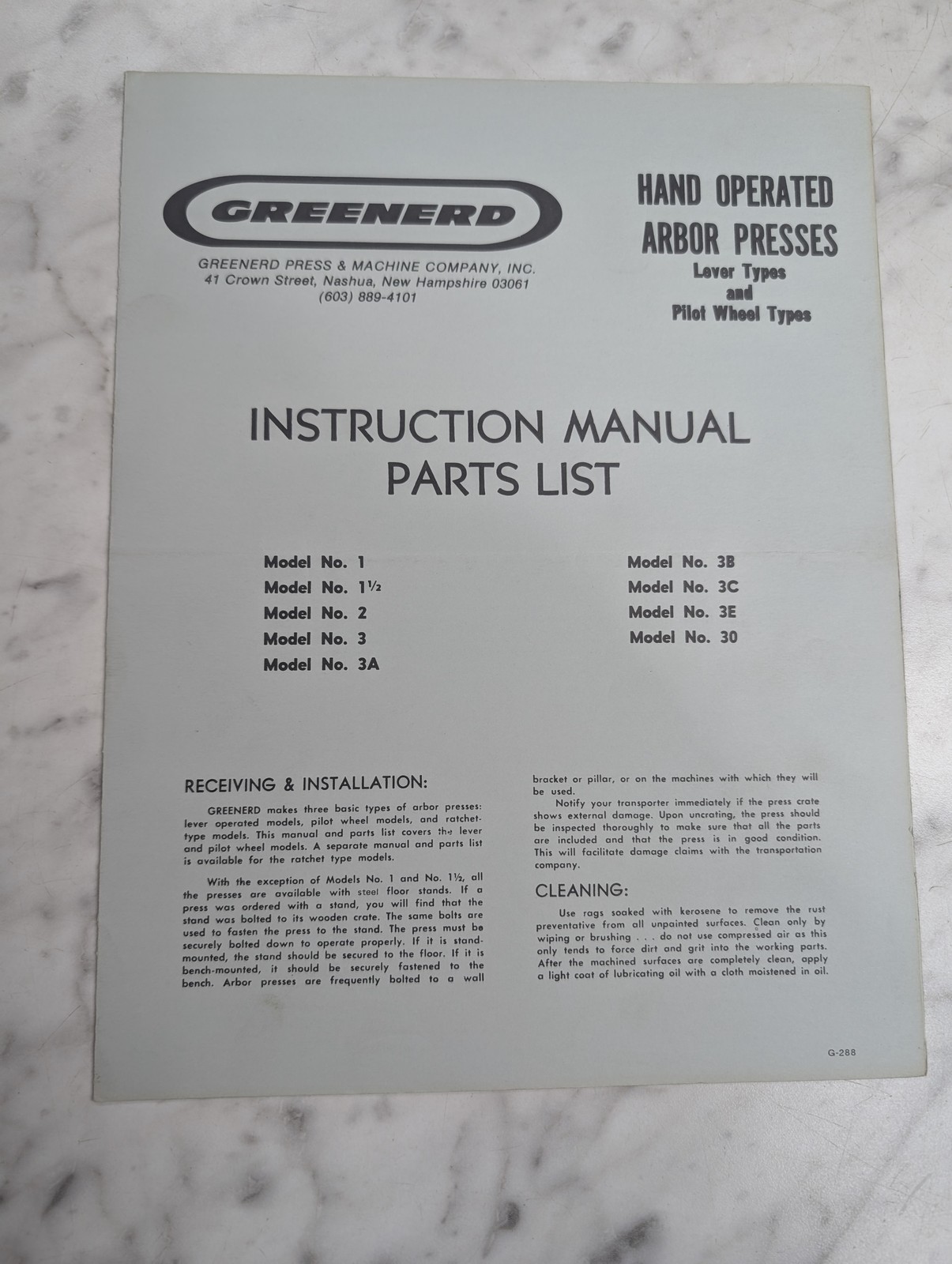 Greenerd Hand Operated Arbor Press Owner Manual Parts List Models 1 3C 3A & More