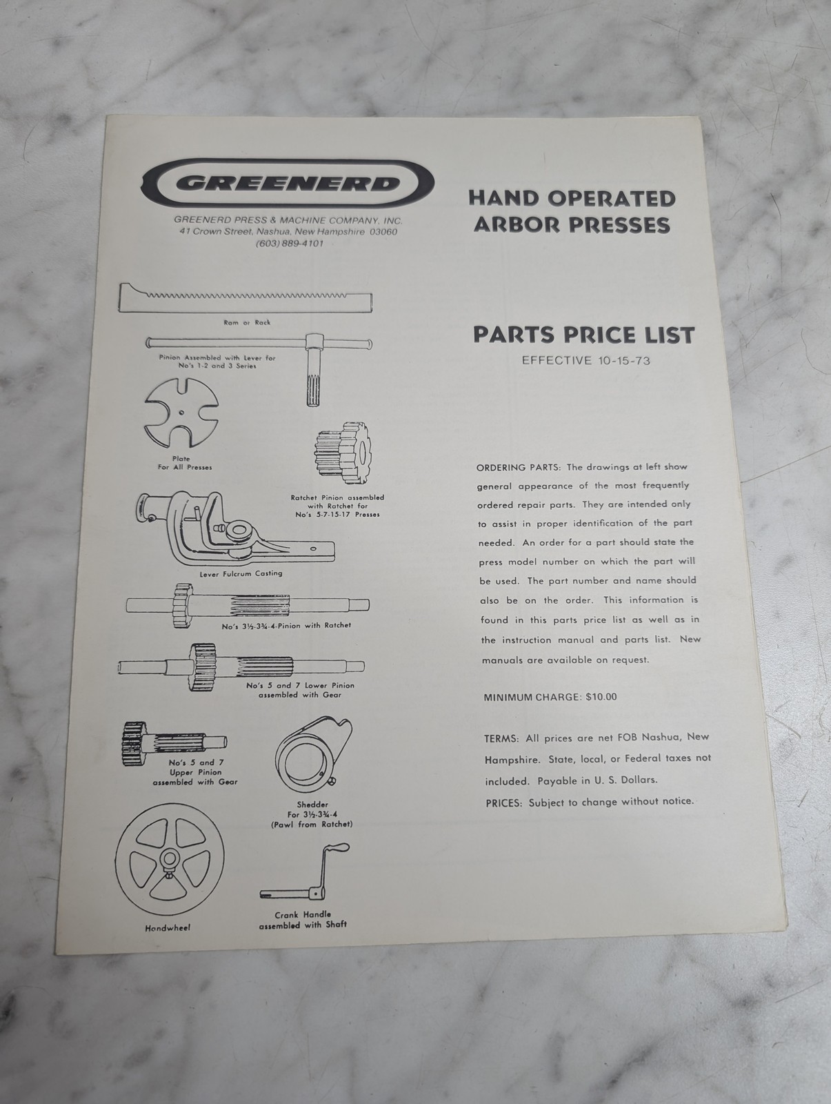 Greenerd Hand Operated Arbor Press Parts Price List 1973