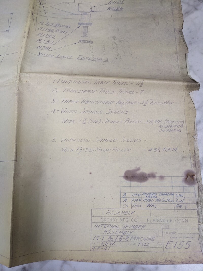 Grenby Manufacturing Internal Grinder Assembly Print Diagram Drawing 1G-1 1G-2