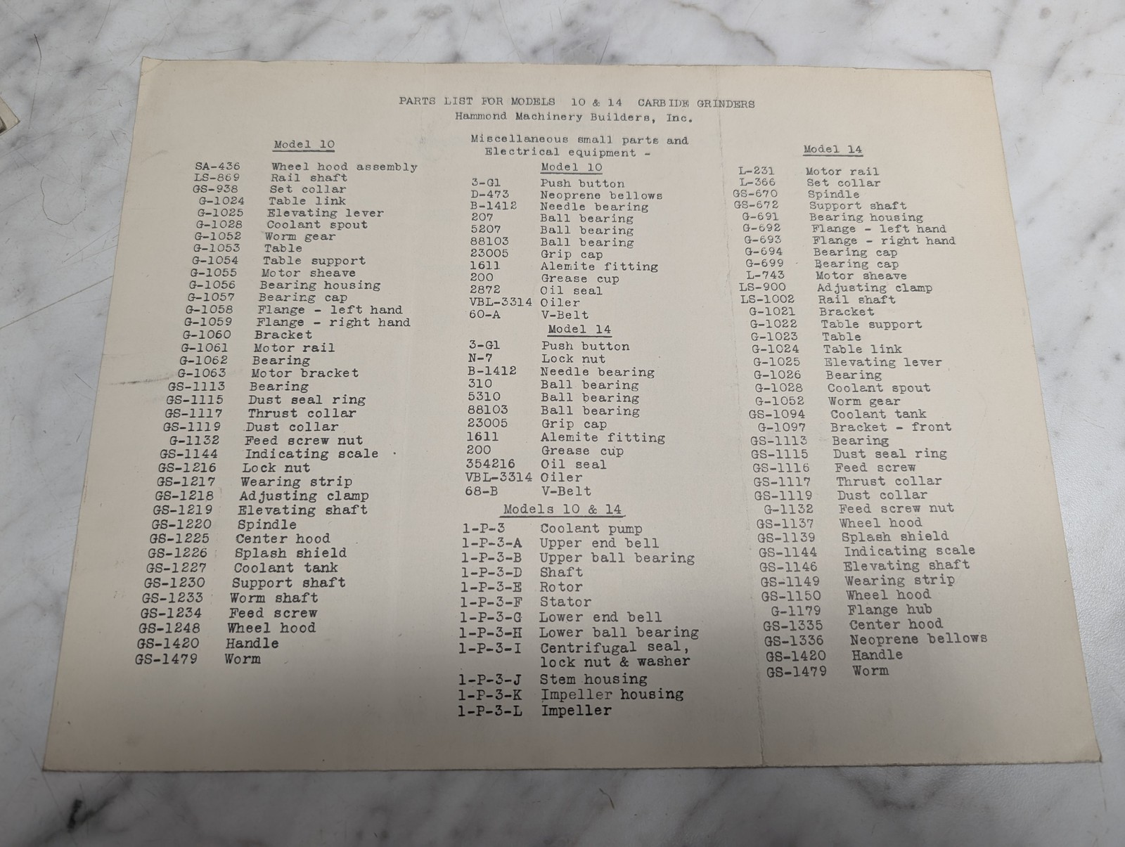 Hammond Illustrated Parts List Drawing Model 10 14 Carbide Tool Grinder Manual