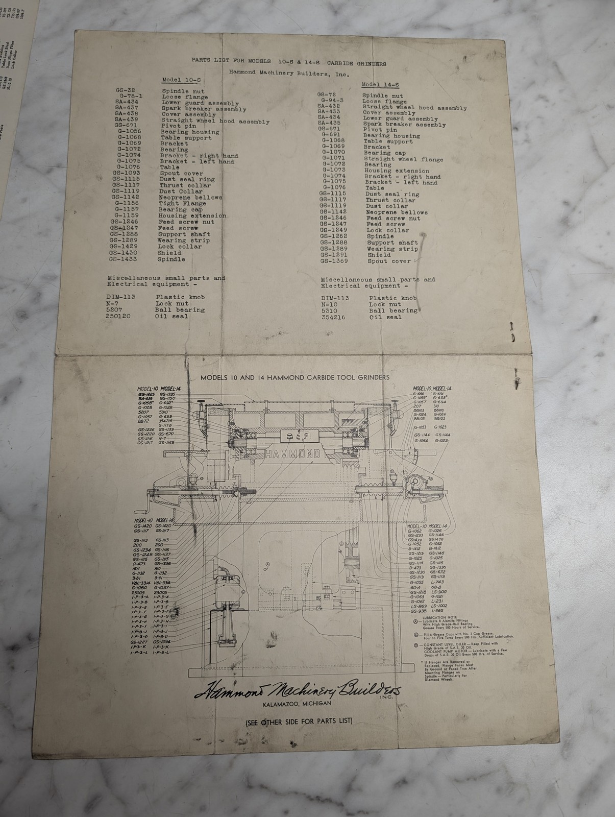 Hammond Illustrated Parts List Drawing Model 10S 14S Carbide Tool Grinder Manual