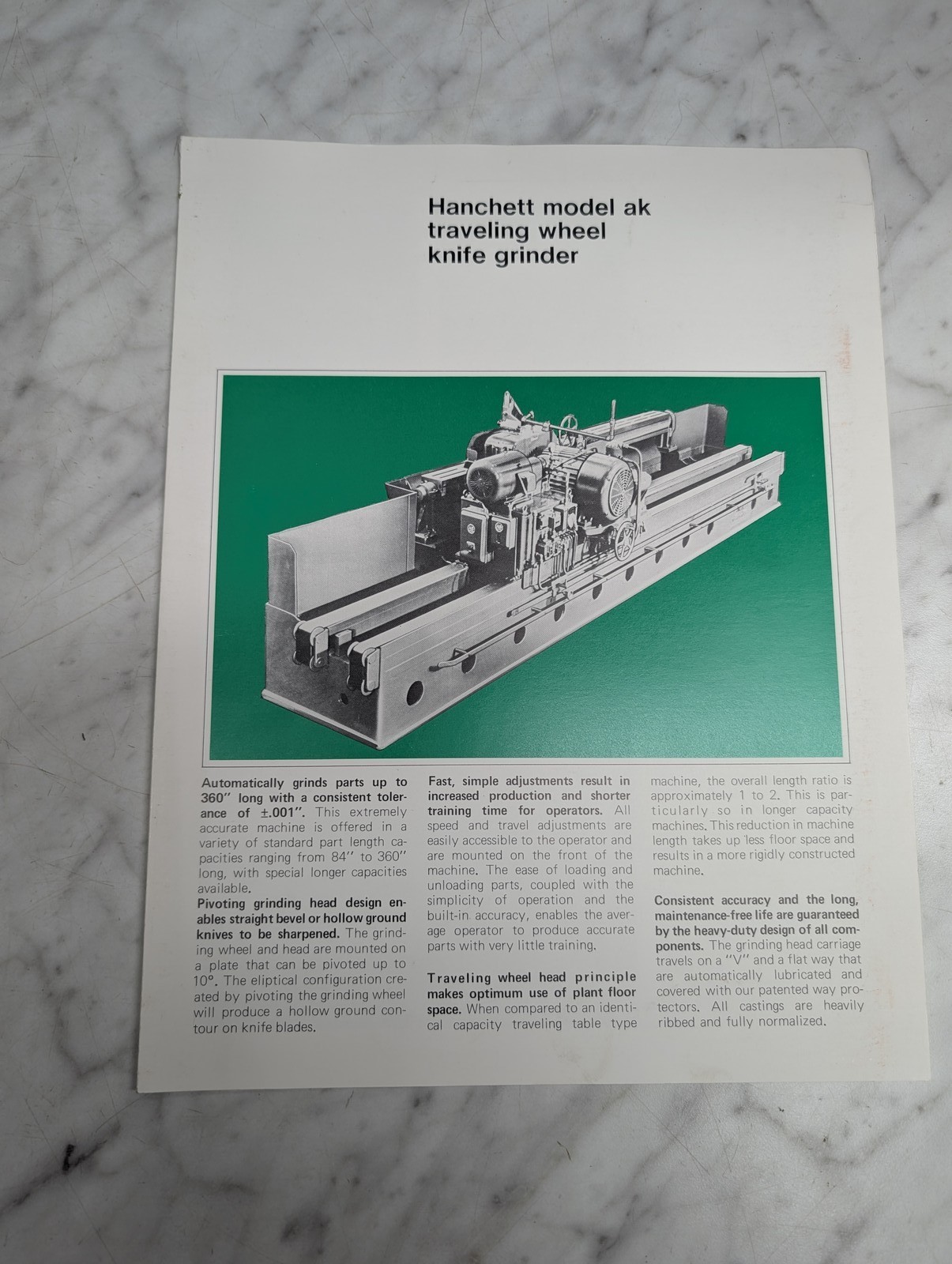 Hanchett Model Ak Traveling Wheel Knife Grinder Sales Information Brochure