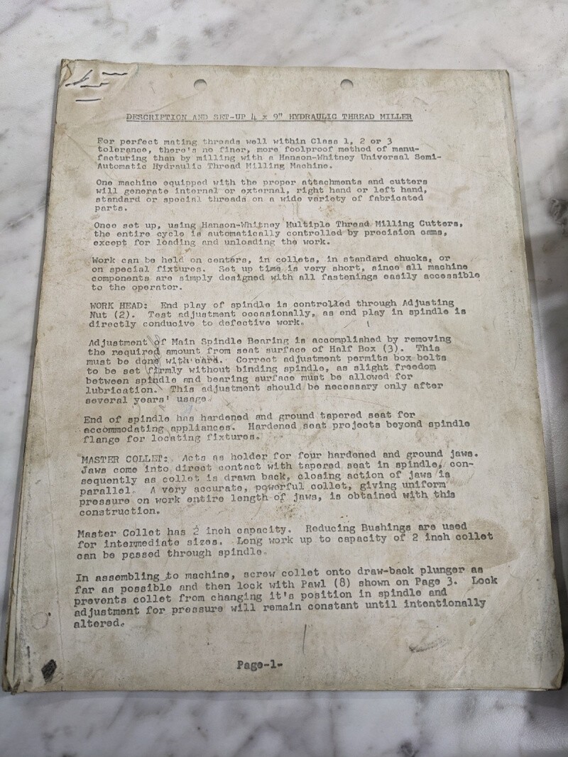 Hanson Whitney Thread Milling Machine 4X9” Set-Up Description Operator Manual