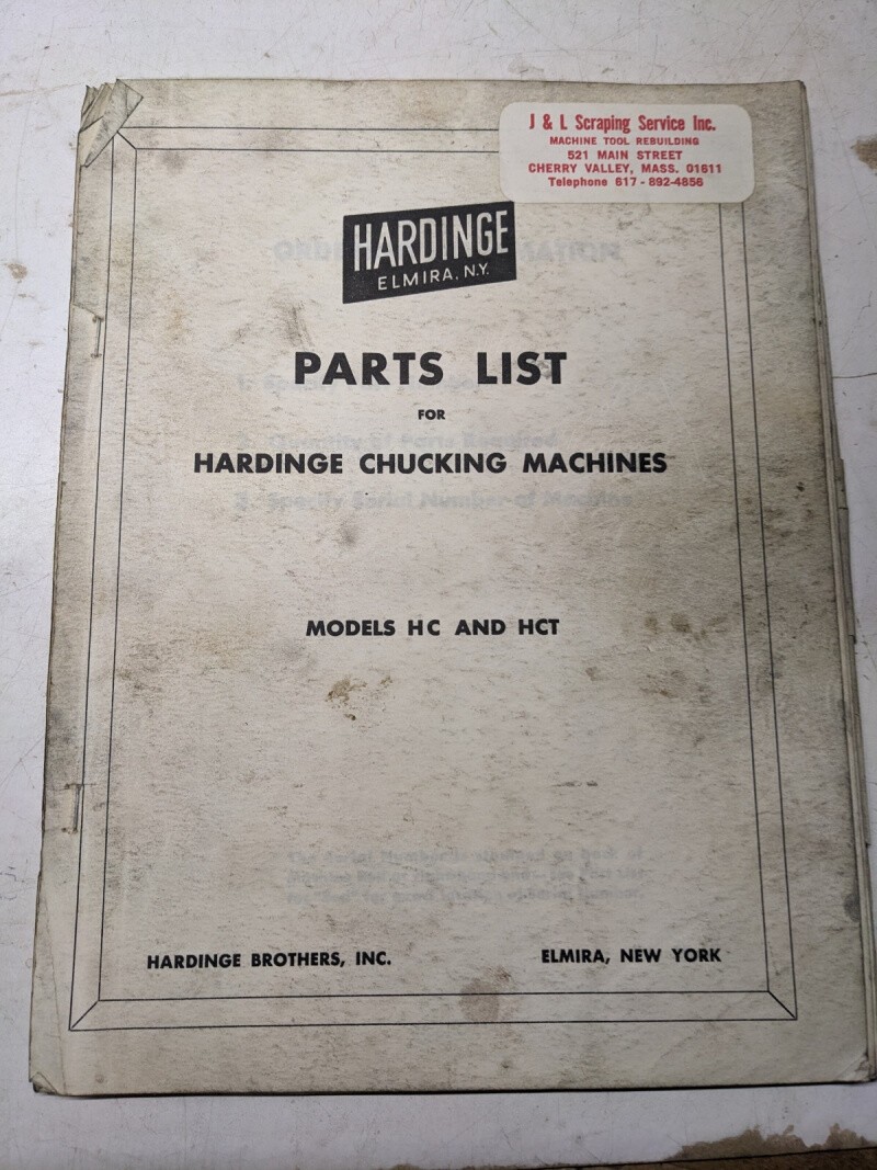 Hardinge Service Parts List Manual Catalog Chucking Machines Model Hc Hct Book