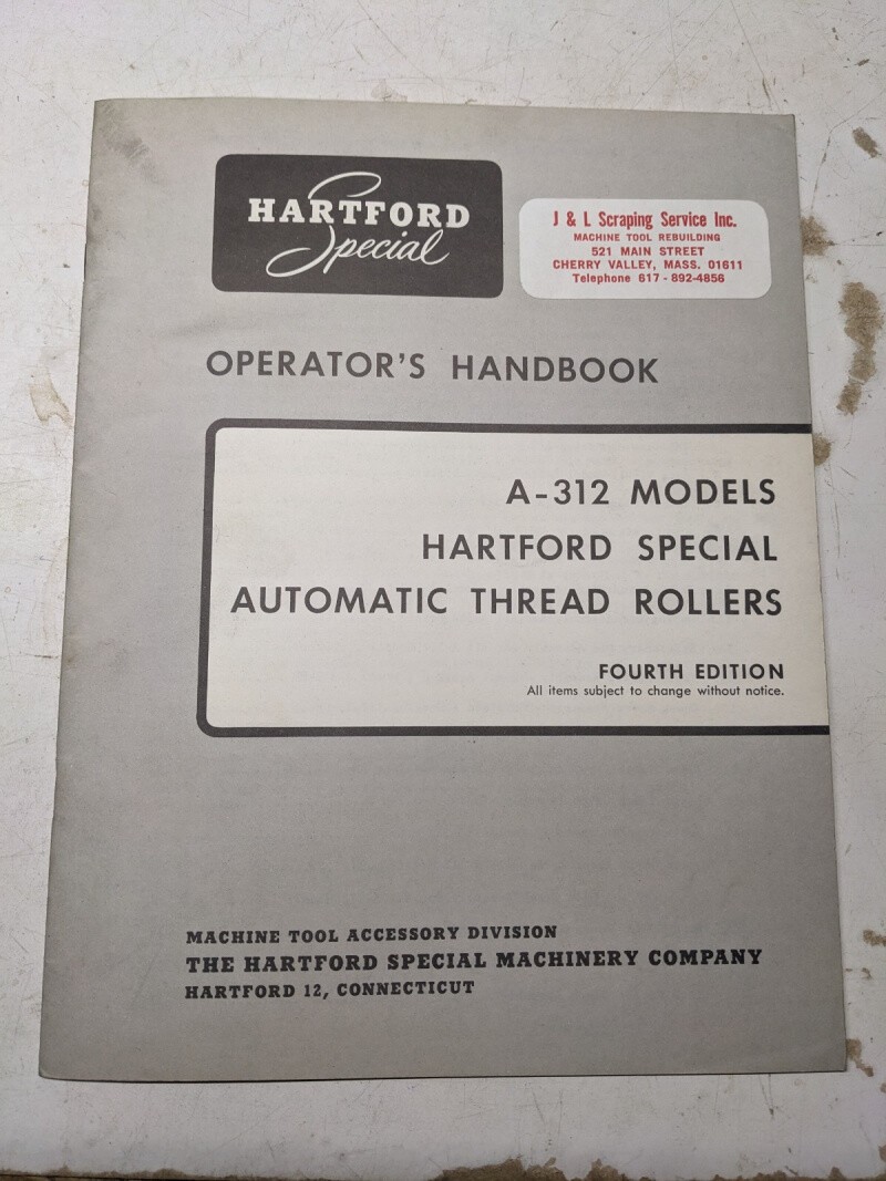 Hartford Special Operator Service Manual A-312 Thread Roller Machine Tool