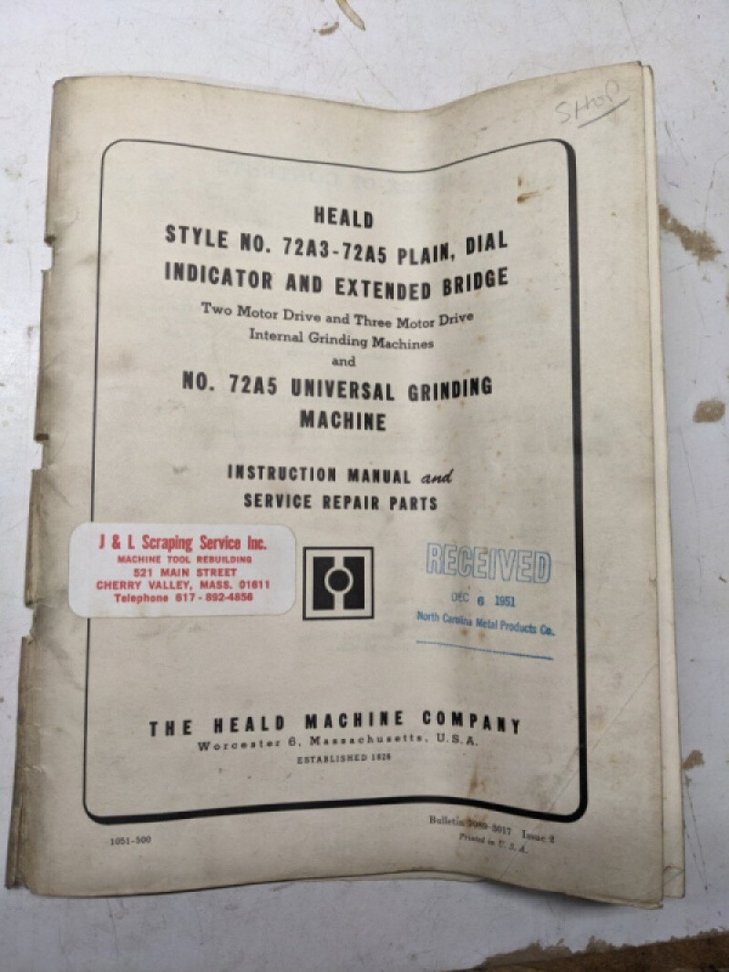 Heald Operator Service Manual Parts List Book Model 72A3-72A5 Grinding Machine