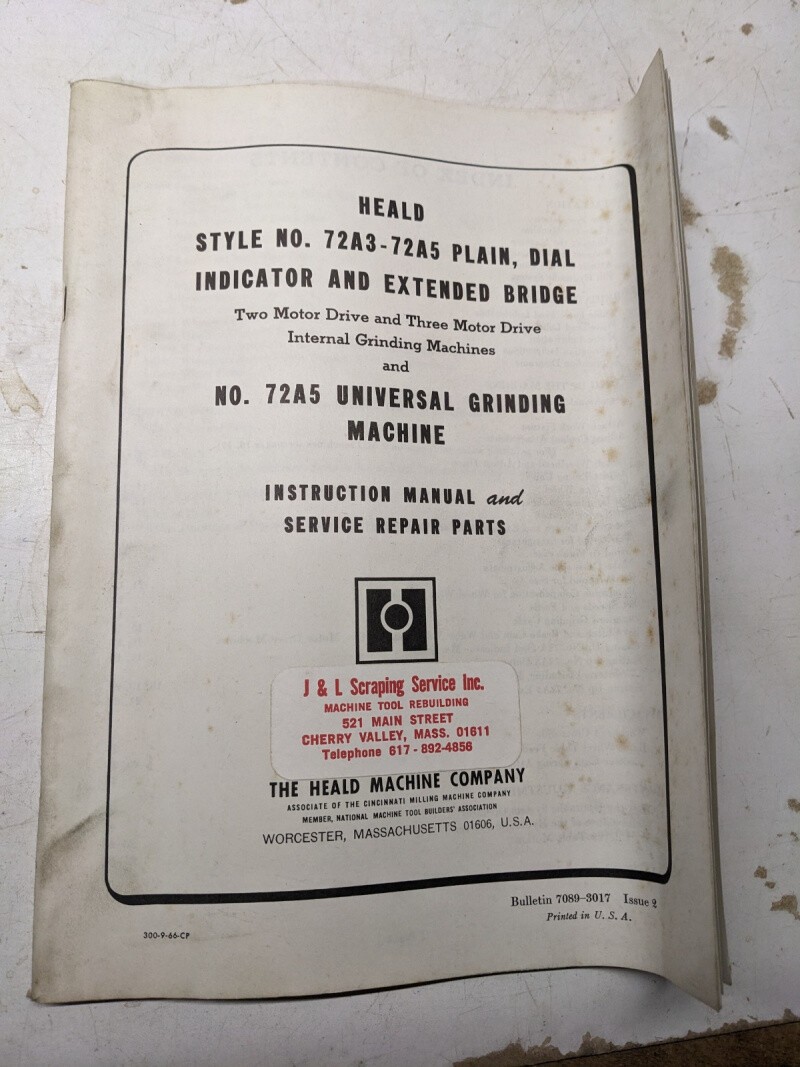 Heald Service Manual Parts List Catalog Model 72A3-72A5 Grinding Machine