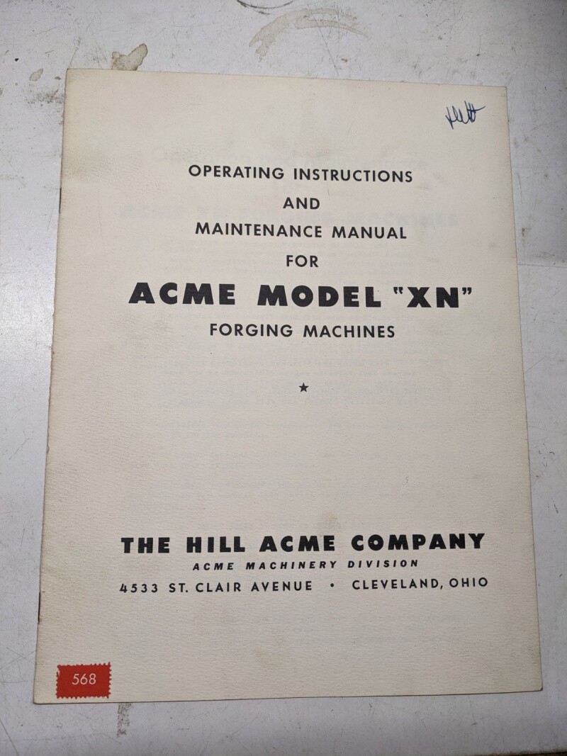 Hill Acme Operator Service Maintenance Manual Acme Model Xn Forging Machine 1947