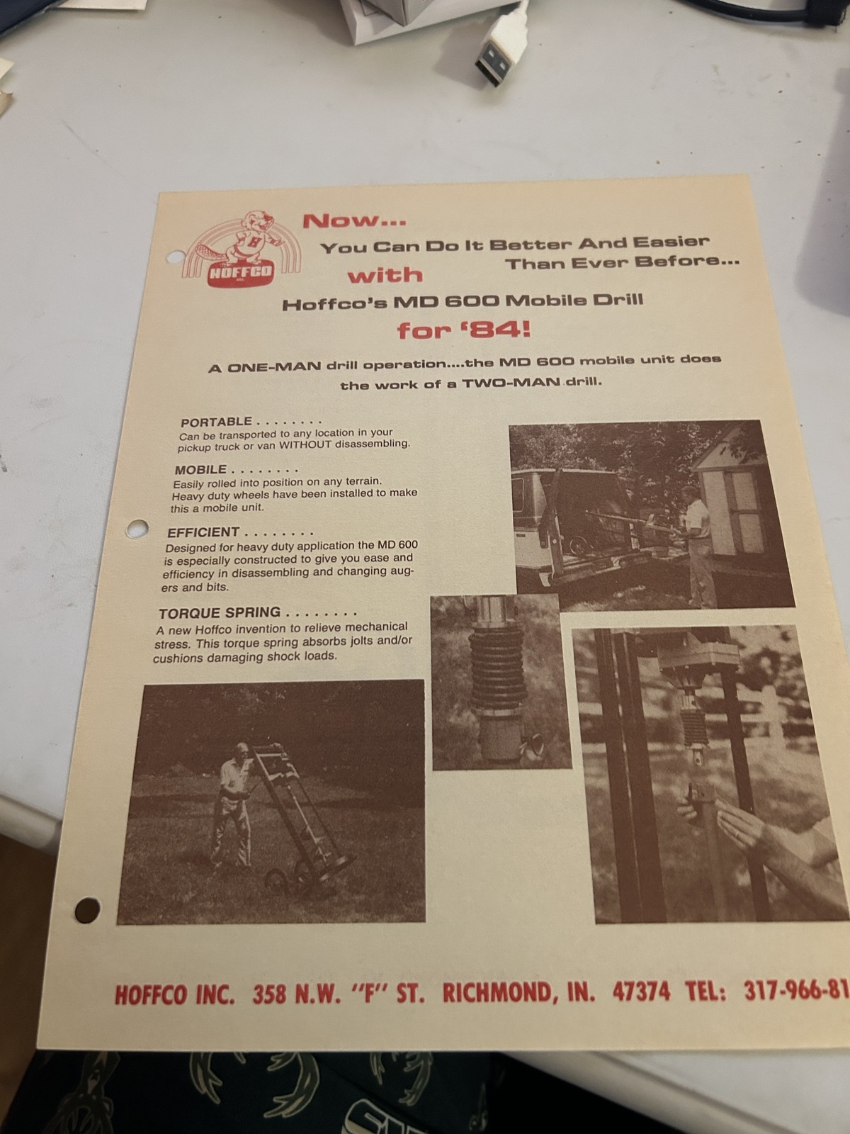 Hoffco Md600 Mobile Earth Auger Drill 1984 Sales Brochure 3.8Hp One Man