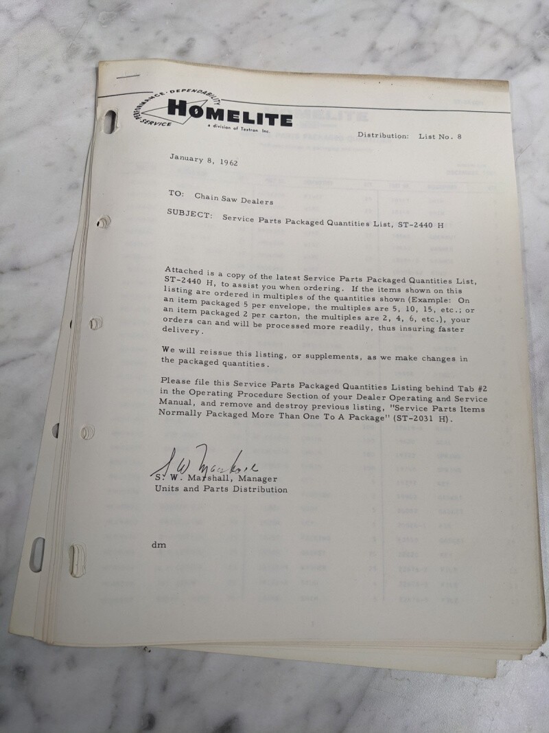 Homelite Dealer Service Parts Packaged Quantities List St-2440 H 1962 Literature