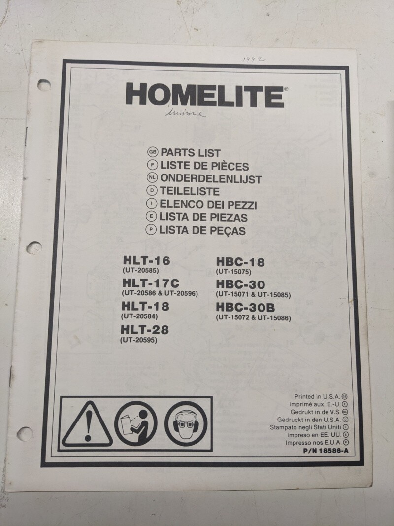 Homelite Illustrated Parts List Book Catalog Manual Trimmer Hlt Hbc 18586-A