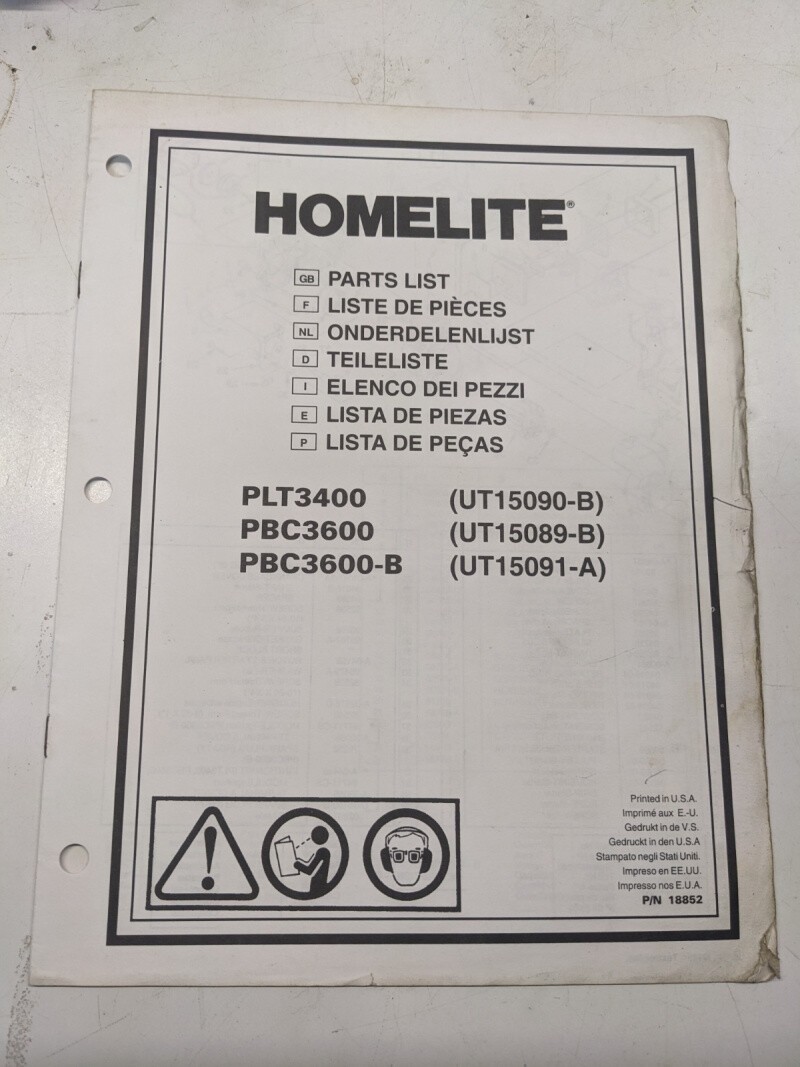 Homelite Illustrated Parts List Catalog Manual Trimmer Plt Pbc 3400 3600 18852