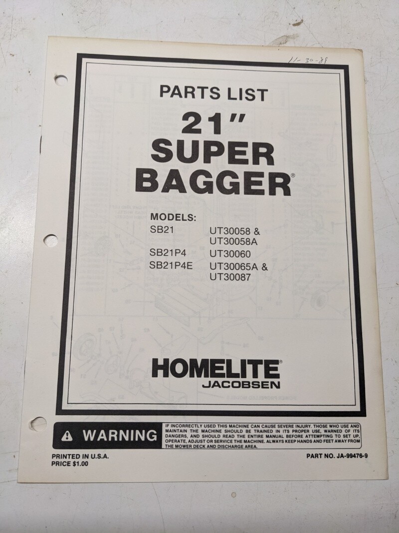 Homelite Illustrated Parts Manual List Mower 21” Super Bagger Sb21P4E 99476-9