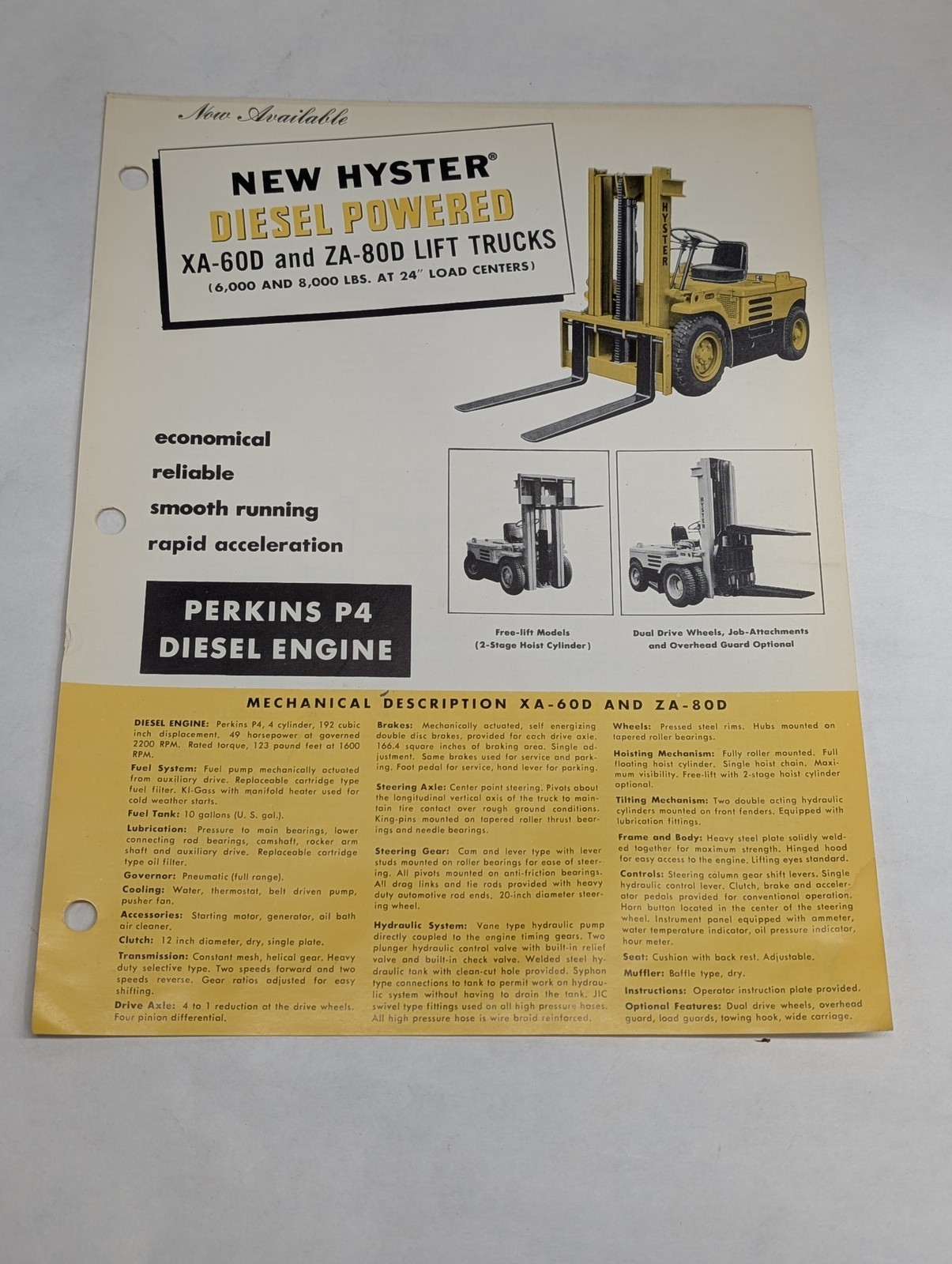 Hyster Fork Lift Truck Sales Brochure Information Sheet Xa-60D Za-80D 1955