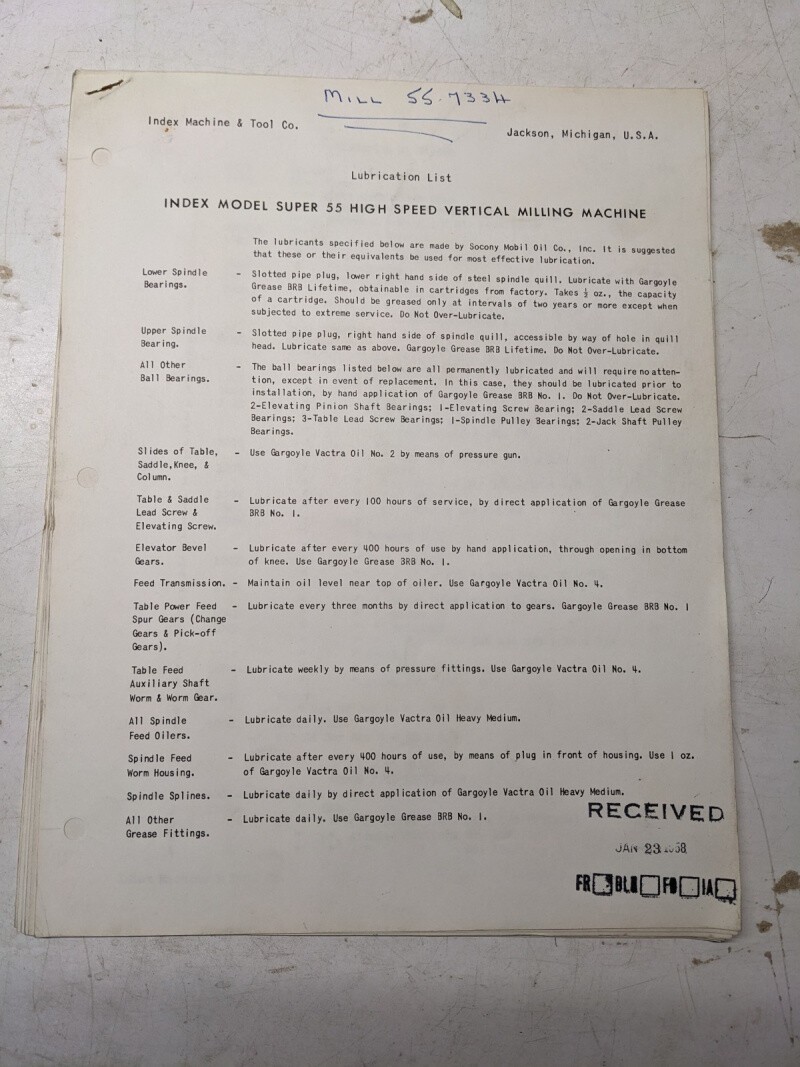 Index Machine Tool Company Super 55 Model Milling Machine Lubrication/Parts List