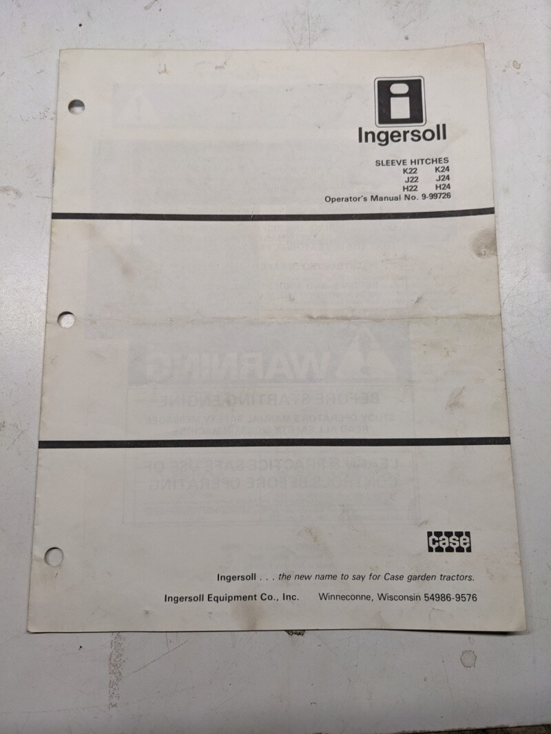 Ingersoll Lawn Case Tractor Sleeve Hitches K J H 22 24 9-99726 Operators Manual