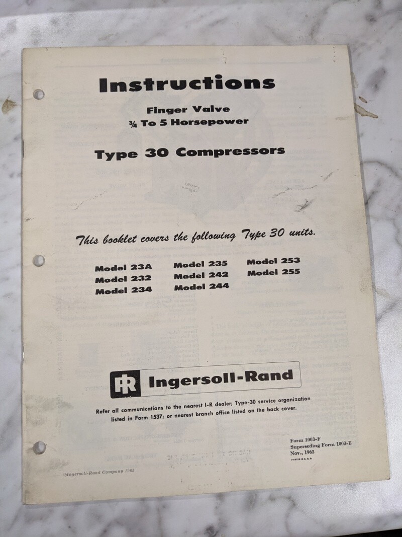 Ingersoll Rand Type 30 0.75-5Hp Air Compressor Instruction Operator Manual 1963