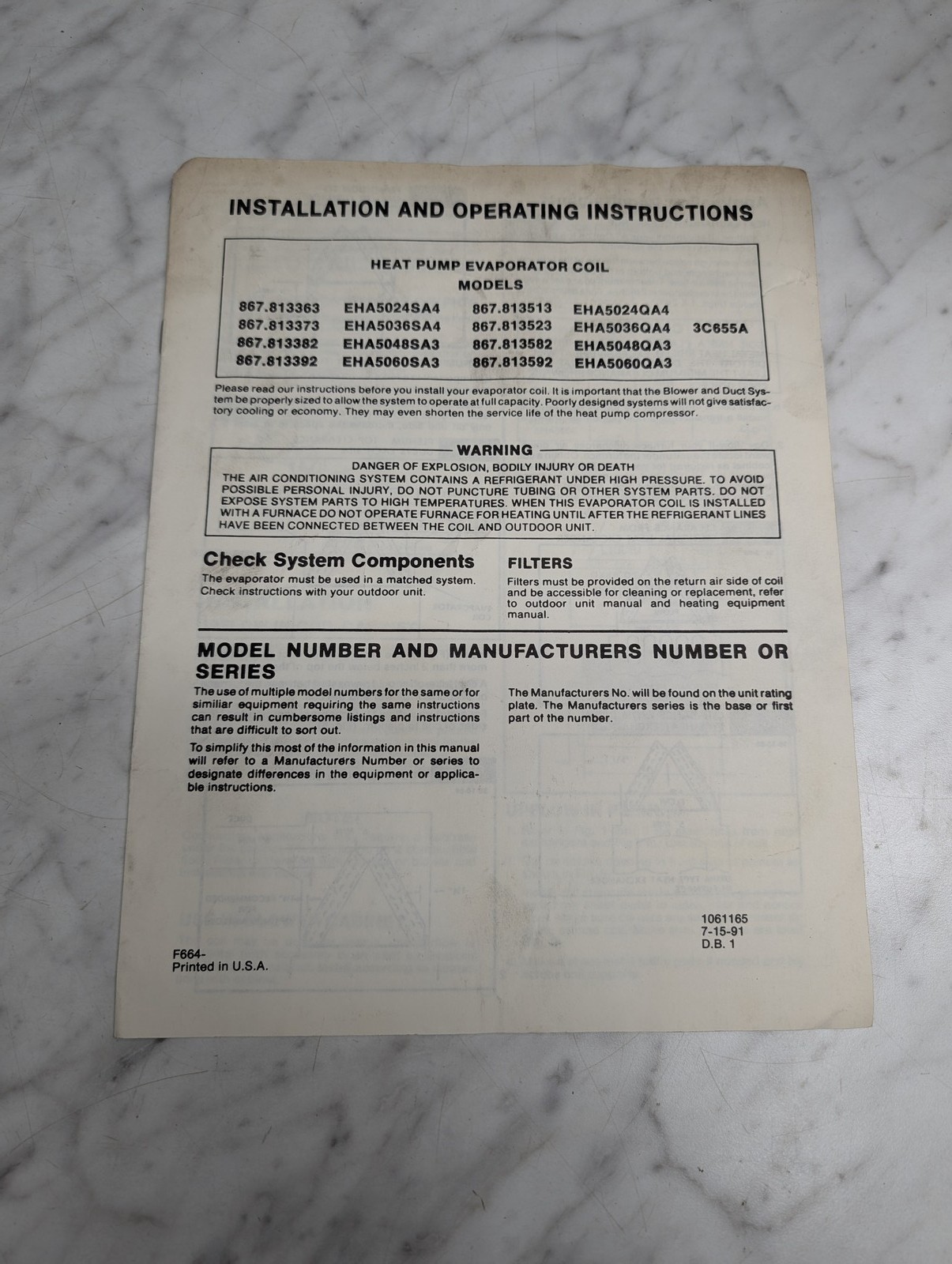 Installation & Operating Instruction Guide Heat Pump Evaporator Coil 1991