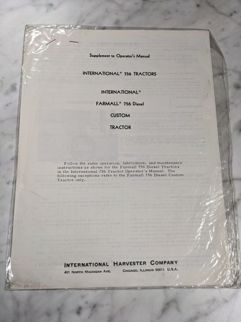 International Harvester 756 Tractors Farmall Diesel Supplement Operator Manual
