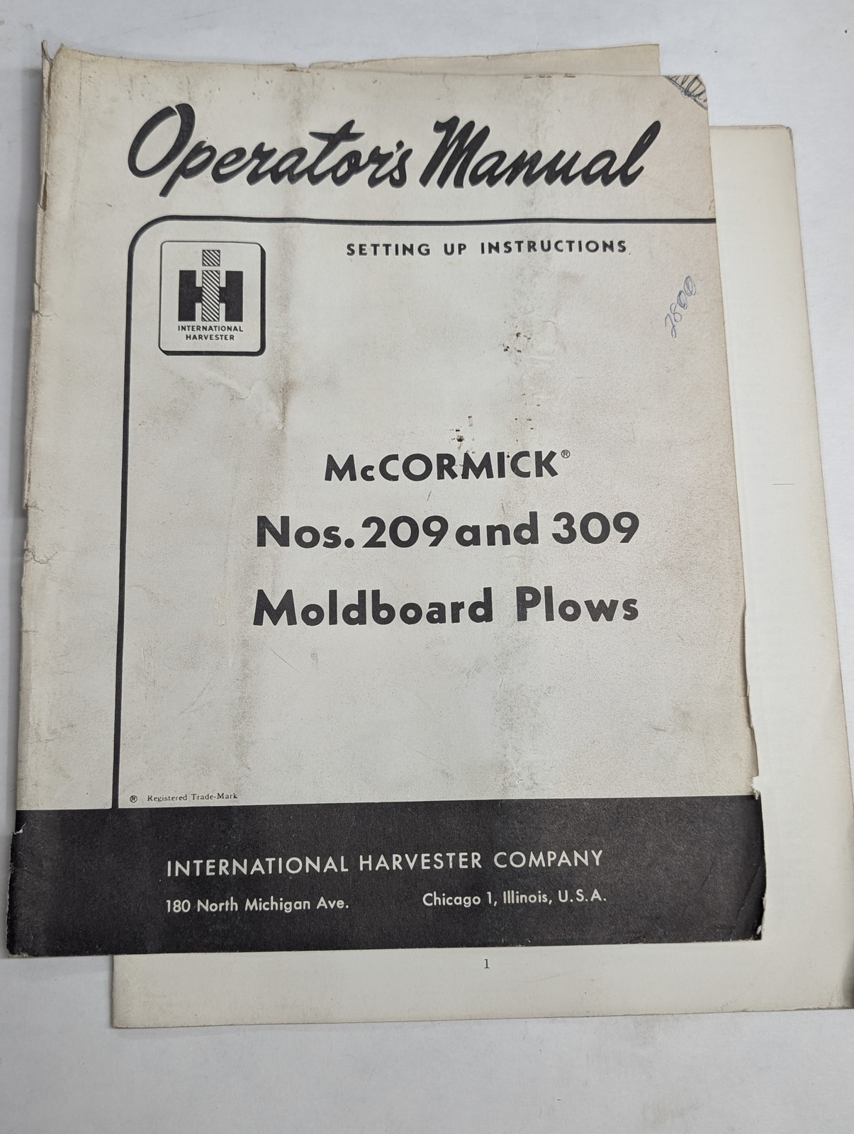 International Harvester Ih Operator’S Manual Mccormick #209 309 Moldboard Plow