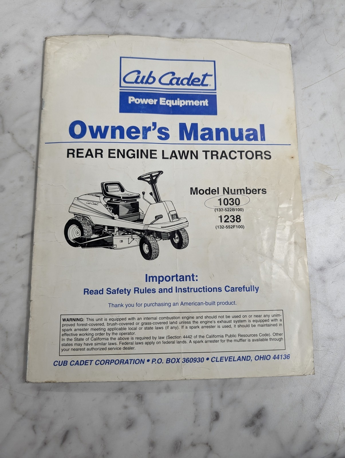 International Ih Cub Cadet Operator’S Owners Manual 1030 1238 Lawn Tractors