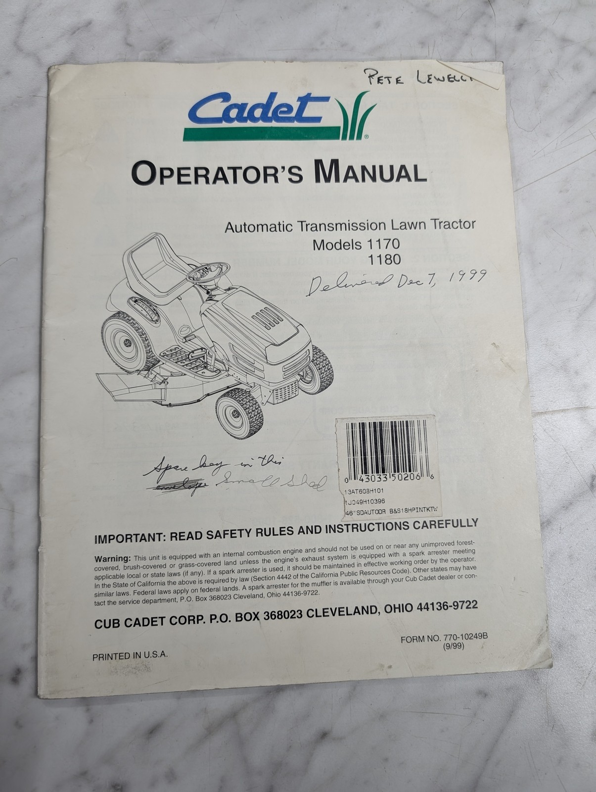 International Ih Cub Cadet Operator’S Owners Manual 1170 1180 Lawn Tractors