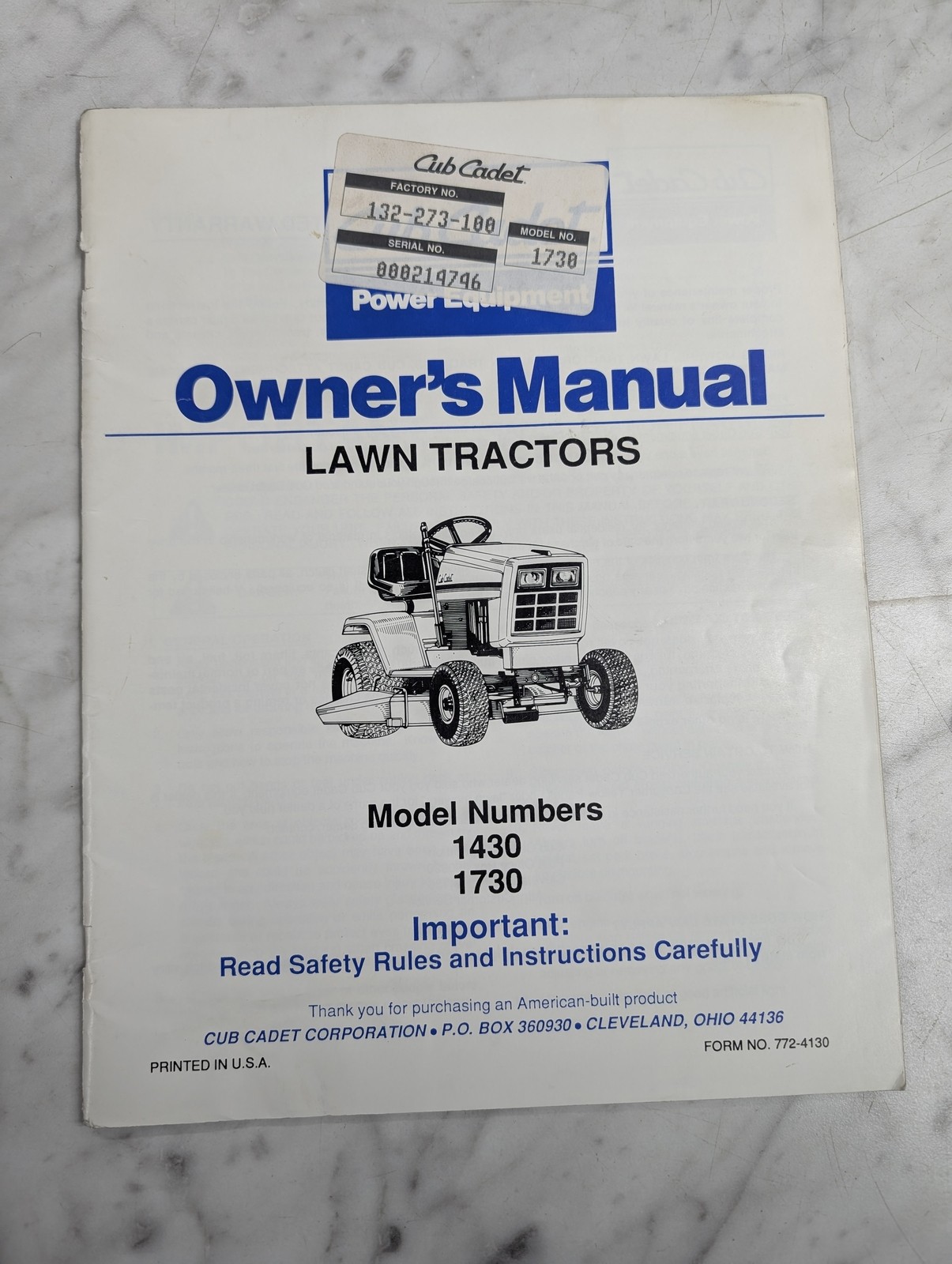 International Ih Cub Cadet Operator’S Owners Manual 1430 1730 Lawn Tractors