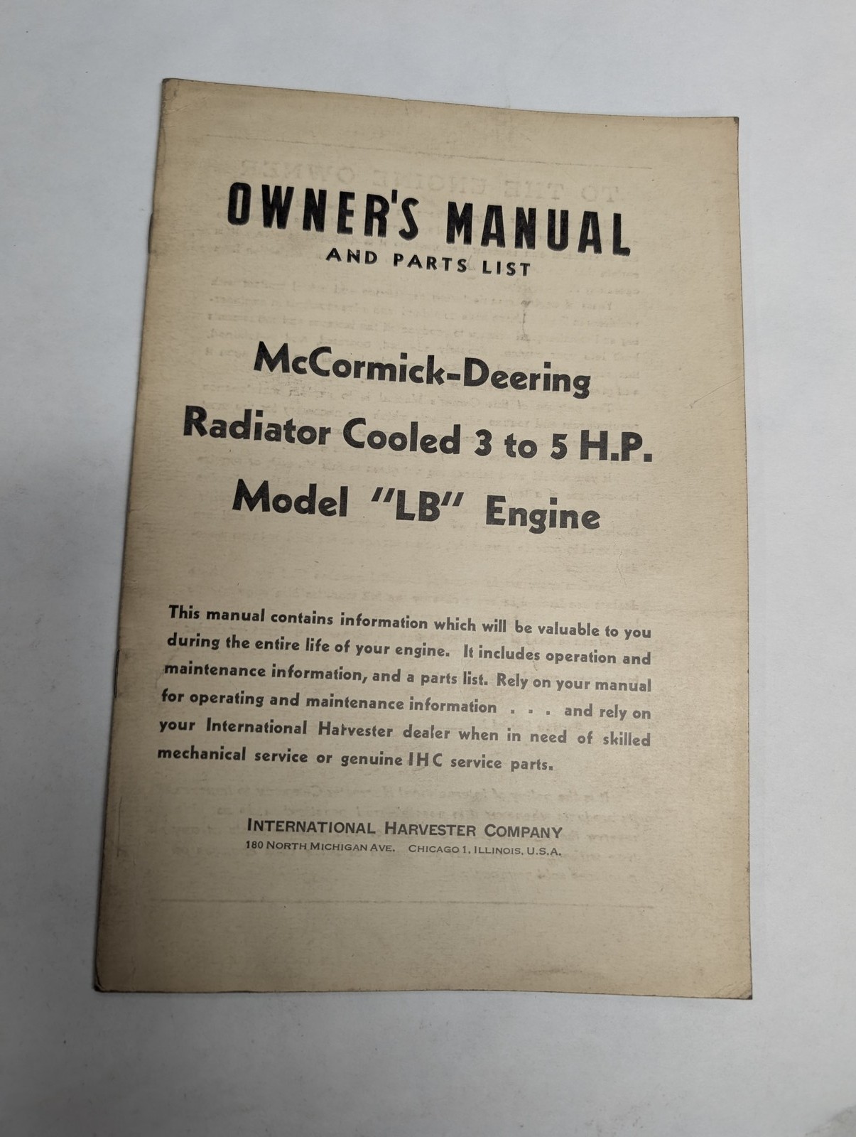 International Ih Radiator Cooled Model Lb Engines Owners Manual Parts List