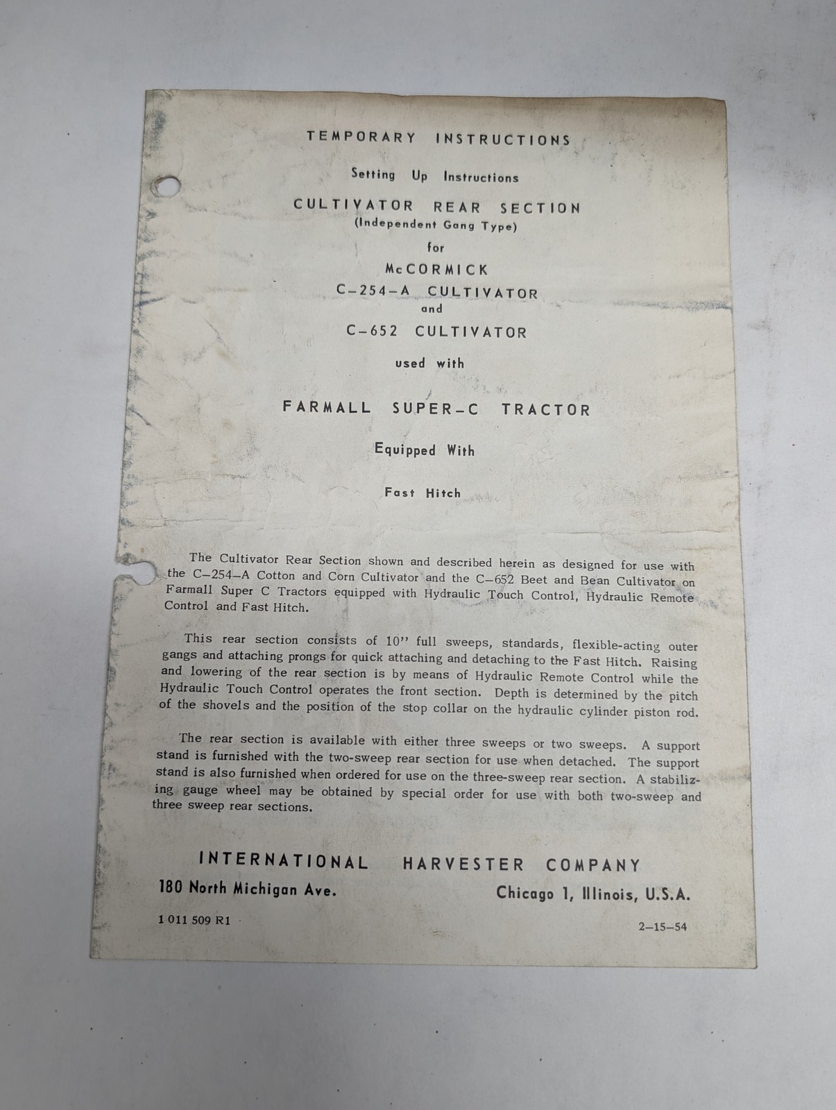 International Ih Temporary Instructions Setup Mccormick Cultivator C-254-A C-652