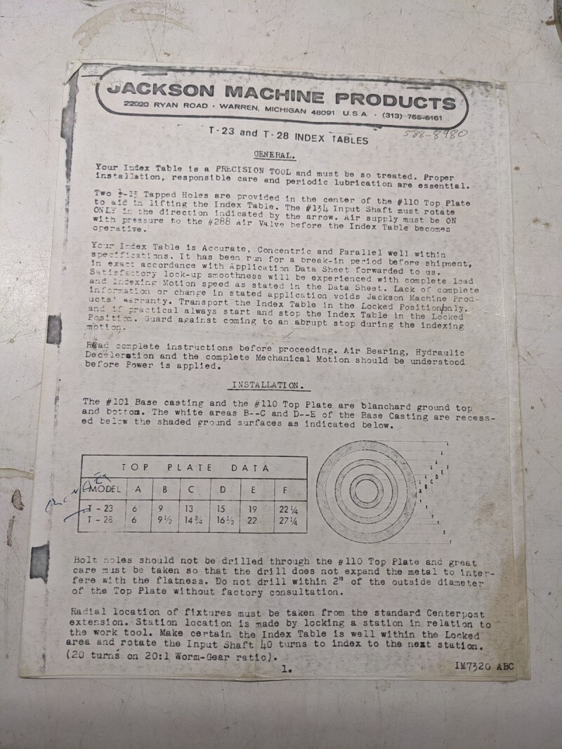 Jackson Machine T-23 T-28 Index Tables Operator Service Manual Parts List Copy