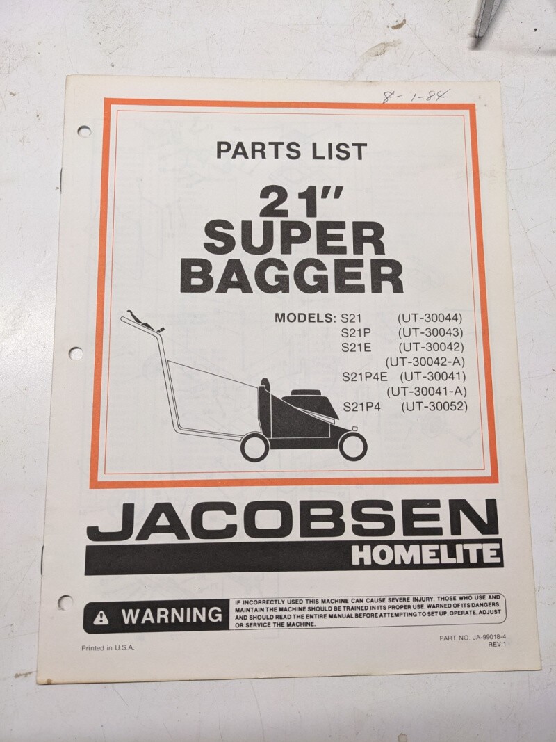 Jacobsen Illustrated Parts Catalog Manual List 21” Super Bagger S21P4E 99018-4