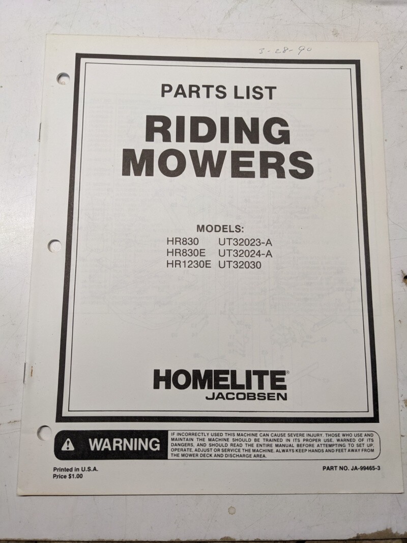 Jacobsen Illustrated Parts Catalog Manual List Riding Mower Hr830 1230E 99465