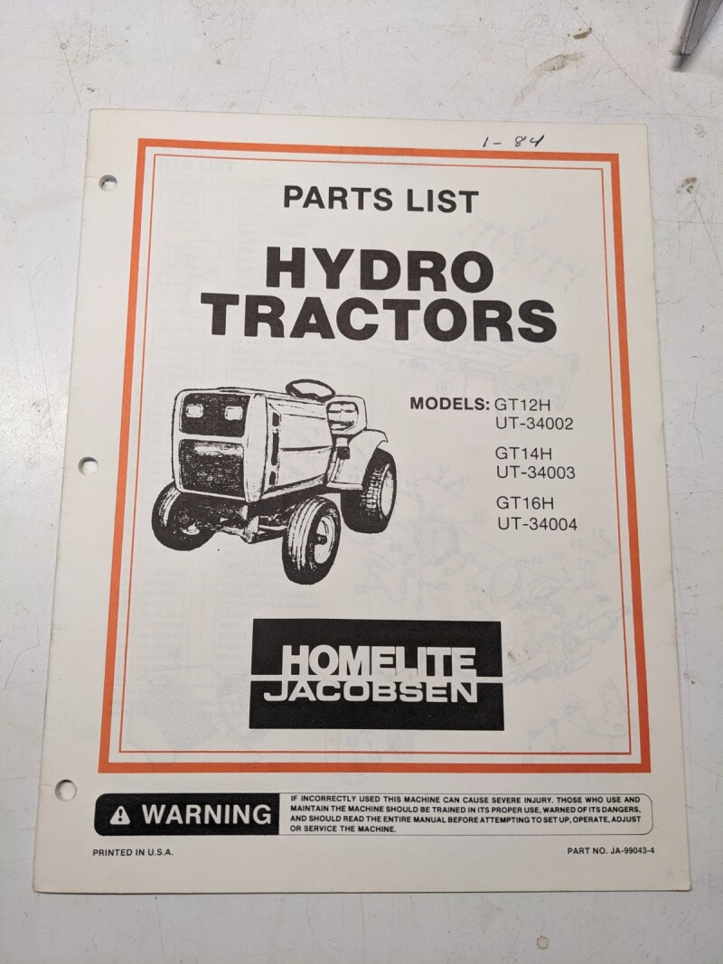 Jacobsen Illustrated Parts Manual List Hydro Tractor Gt12H 14H 16H Ja-99118-4