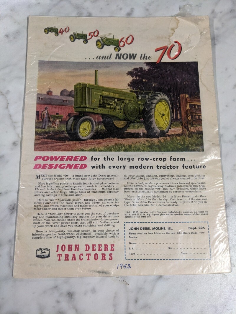 John Deere 1953 Vintage Tractor 70 Series Jd Row-Crop Farm Advertisment