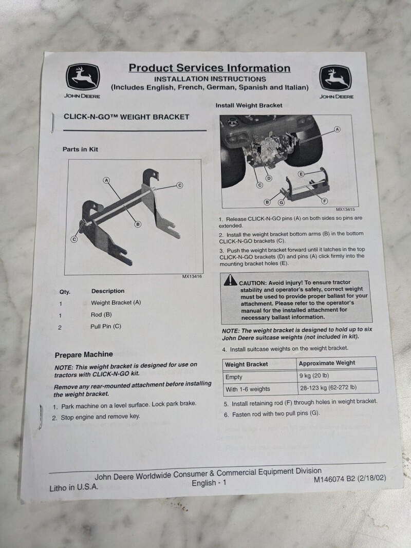 John Deere Click-N-Go Weight Kit Installation Instruction Manual M146074
