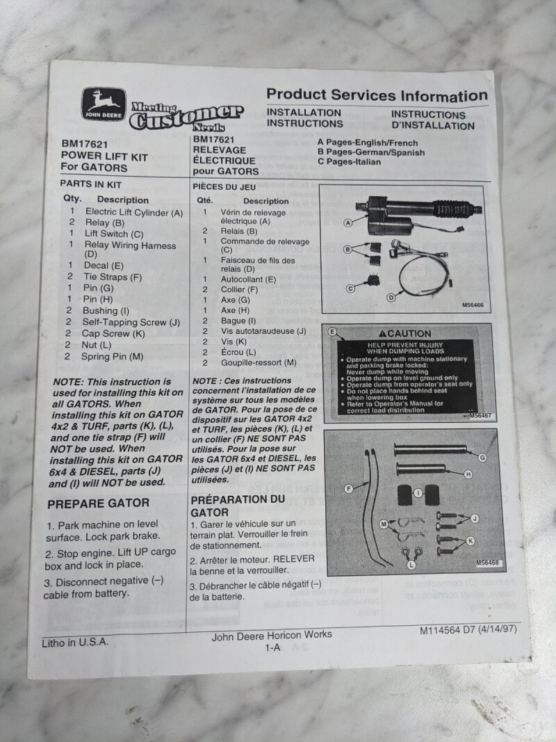 John Deere Installation Instruction Manual Bm17621 Power Lift Kit M114564