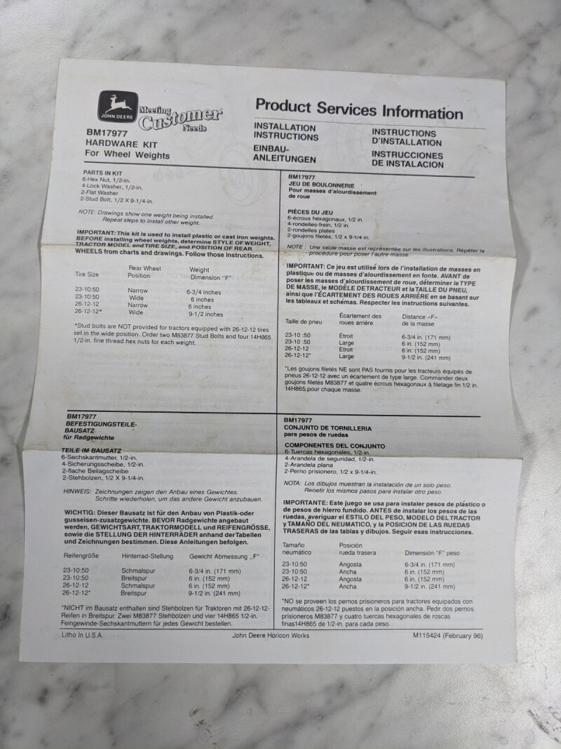 John Deere Jd Product Service Information Bm17977 Harward Kit Wheel Weights 1996